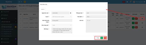 - Nút Duyệt (Biểu tượng tích xanh): Nhấn để xác nhận báo cáo của nhân viên là hợp lệ và hoàn thành.