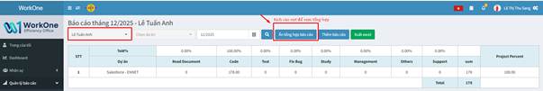 Hiện tổng hợp báo cáo: Xem bảng tóm tắt tổng quát lượng thời gian làm việc theo dự án trong tháng.