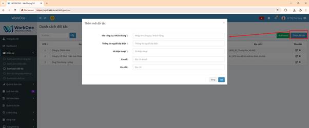 Chức năng Danh sách đối tác được thiết kế để quản lý thông tin các tổ chức, cá nhân đang hợp tác với công ty, giúp việc tra cứu thông tin liên lạc và địa chỉ trở nên nhanh chóng.