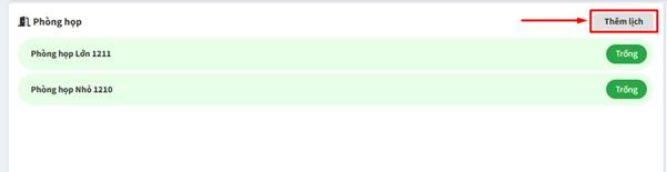Hiển thị trạng thái phòng họp (đang sử dụng (màu đỏ), sắp bắt đầu (màu vàng) hoặc trống (màu xanh lá)). Người dùng nhấn Thêm lịch để đặt phòng họp.