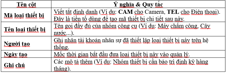 - Lưu ý: Hệ thống thường sẽ không cho xóa nếu loại thiết bị đó đã có dữ liệu thiết bị chi tiết đi kèm để bảo toàn tính toàn vẹn của báo cáo.