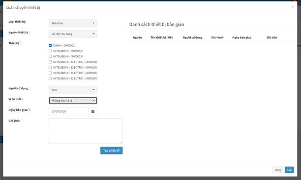 - Vị trí mới: Chọn phòng ban hoặc khu vực thiết bị sẽ được đặt (Ví dụ: Phòng Dev 1210, Văn phòng 1209…).
