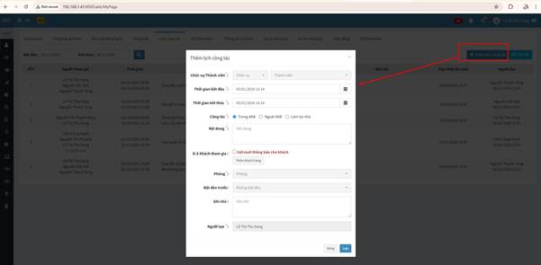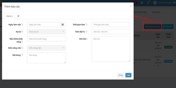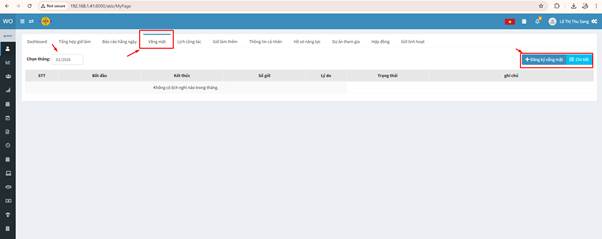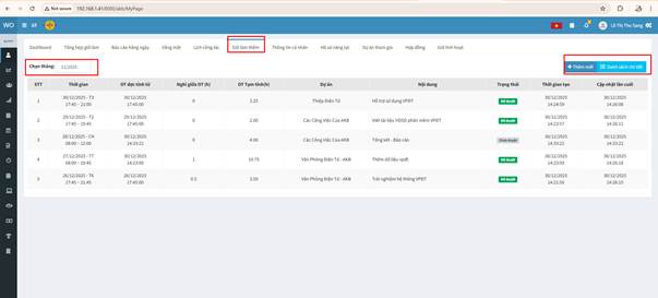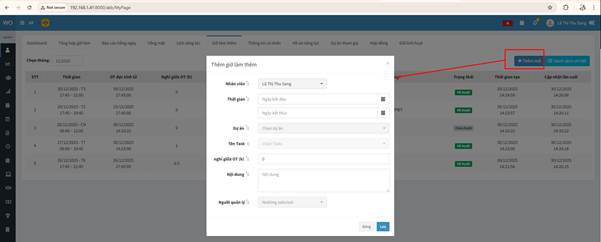 + Thêm mới: Nhấn vào đây để tạo đơn đăng ký làm thêm giờ mới. Cần điền các thông tin về ngày, giờ, dự án và nội dung công việc.