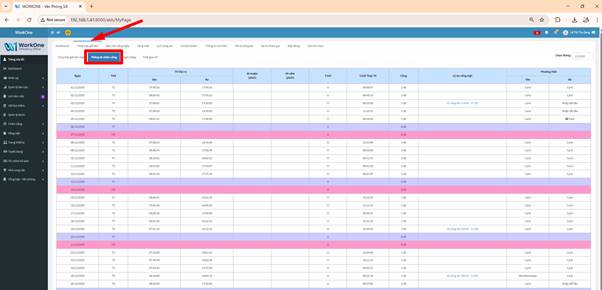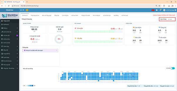 Từ menu bên trái của hệ thống WorkOne, người dùng chọn mục “Trang của tôi”. Màn hình MyPage sẽ hiển thị thông tin làm việc cá nhân theo tháng được chọn.