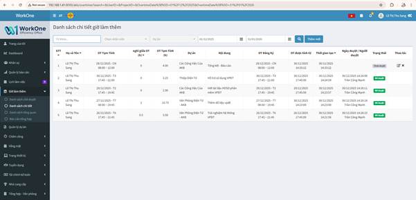 Danh sách chi tiết: Kích vào “Danh sách chi tiết” sẽ hiển thị màn Danh sách chi tiết giờ làm thêm. Để xem bảng tổng hợp chi tiết hơn về các giờ làm thêm.
