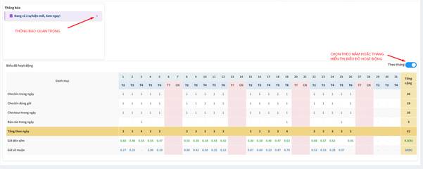 Khối thống kê hiển thị các chỉ số làm việc quan trọng trong tháng: