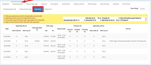 • Nghỉ phép còn lại (h): Số giờ phép còn lại hiện tại